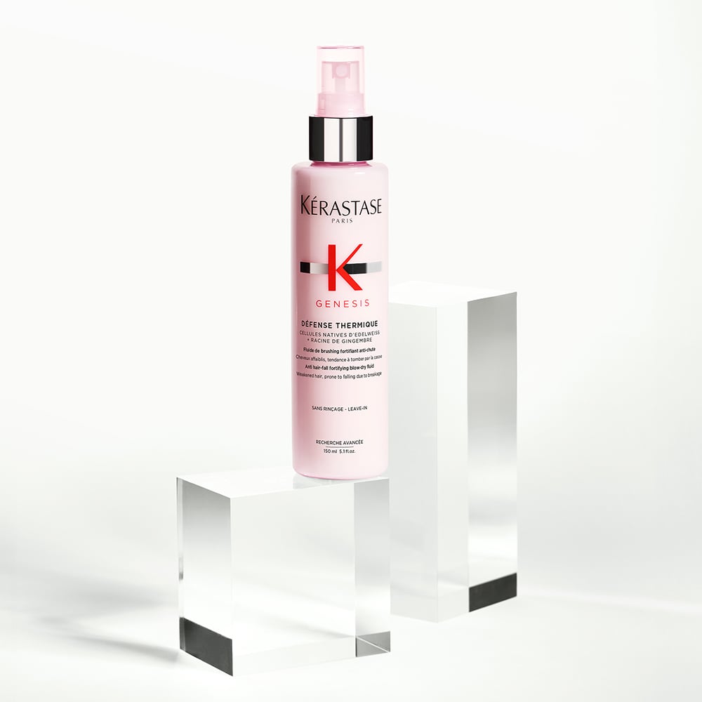 Défense Thermique is an anti hair-fall fortifying blow-dry fluid for weakened hair, prone to falling due to breakage. Provides anti-breakage protection and optimal hydration without frizz and weighing down the hair. Its detangling action helps to prevent hair-fall due to breakage from brushing. Protects from heat up to 220°C.